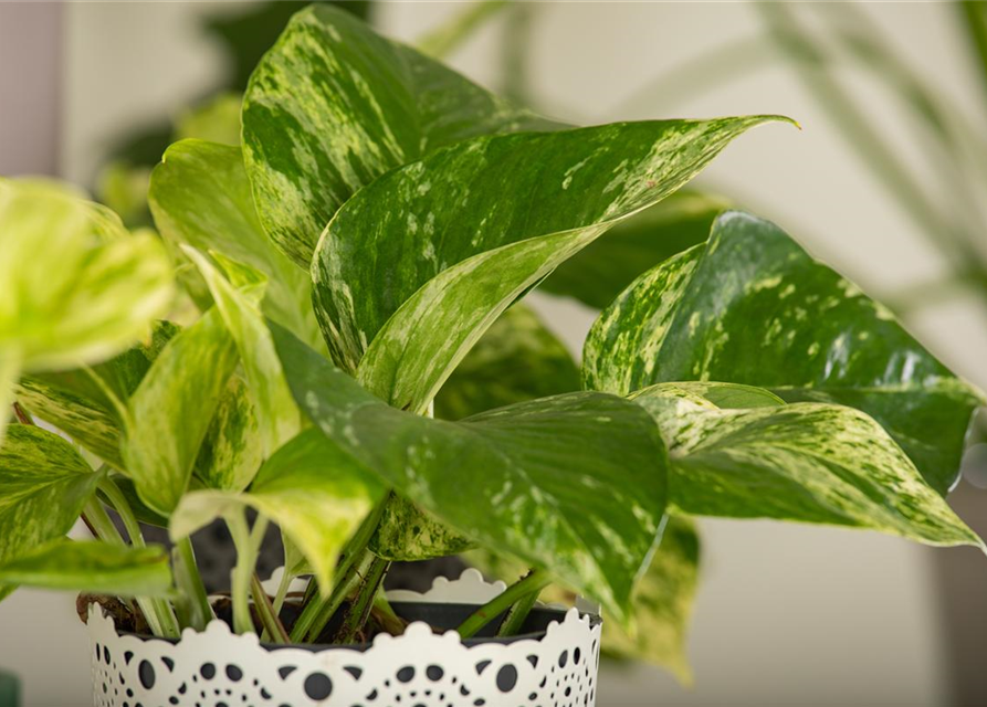 Die Gefleckte Efeutute 'Marble Queen' (Epipremnum pinnatum) trägt gelbbunte, mittelgrüne, weißbunte, herzförmige Blätter. Diese kletternde und rankende Pflanze gedeiht am besten an einem sonnigen bis halbschattigen Standort.