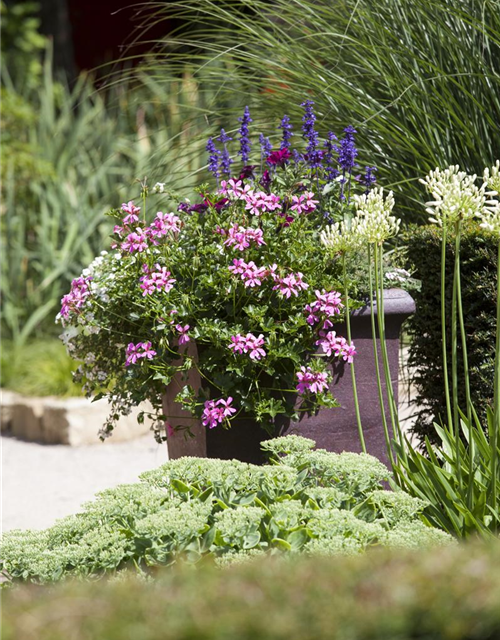 Die Hängegeranie (Pelargonium peltatum) ist eine beliebte Pflanze für den Balkon. Die unzähligen Blüten erscheinen, je nach Sorte, in verschiedenen Farben die ganze Saison hindurch. Ein sonniger bis halbschattiger Standort und ein durchlässiges Substrat werden bevorzugt.