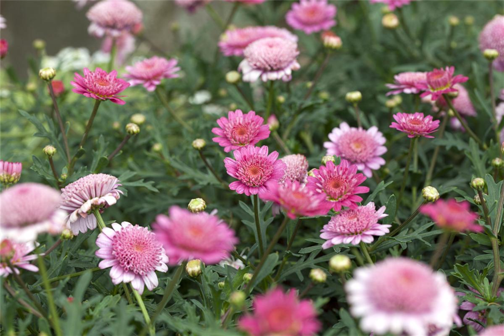 Die Strauchmargerite (Argyranthemum frutescens) ist eine beliebte Pflanze für den Balkon. Die unzähligen Blüten erscheinen, je nach Sorte, in verschiedenen Farben die ganze Saison hindurch. Ein sonniger Standort und ein durchlässiges Substrat werden bevorzugt.