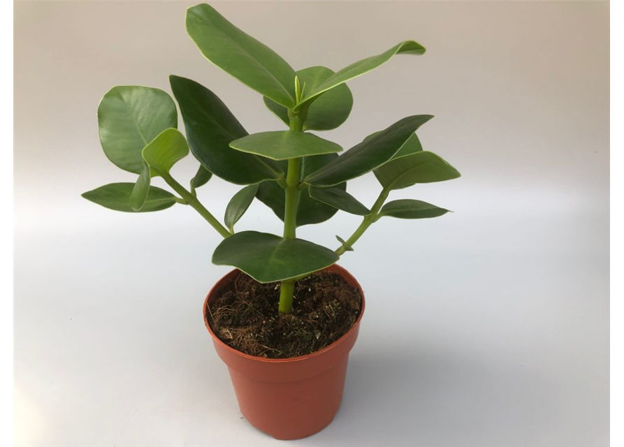 Der Balsamapfel (Clusia major) ist eine weiß mit rosa blühende Pflanze, die eiförmige, dunkelgrüne, ganzrandige Blätter trägt. Seine schalenförmigen Blüten erscheinen von Juni bis August. Diese strauchartige Pflanze gedeiht am besten an einem sonnigen bis halbschattigen Standort. (Preis ohne Deko und Übertopf)