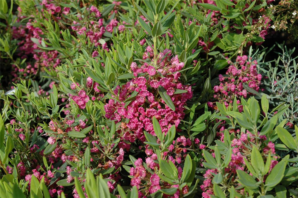 Der Berglorbeer (Kalmia latifolia) ein aufrechter, breiter Strauch, der, je nach Sorte, schalenförmige Blüten in verschiedenen Farben hervorbringt. An einem sonnigen bis halbschattigen Standort mit humosem, saurem Boden erreicht er gewöhnlich eine Höhe von ca. 3 m und wird ca. 3 m breit.