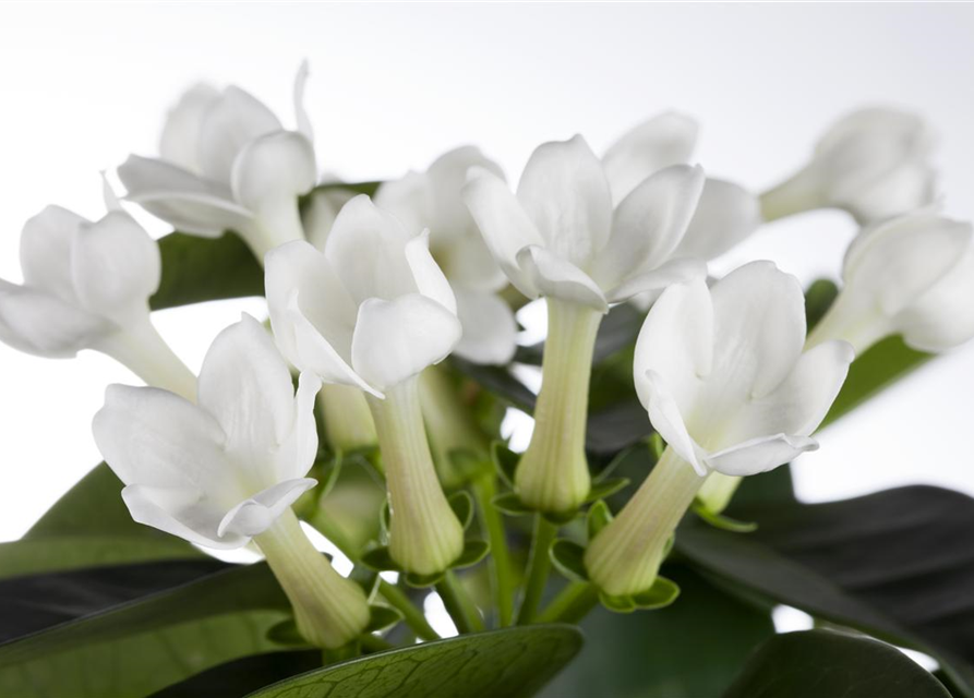 Die Kranzschlinge (Stephanotis floribunda) ist eine weiß blühende Pflanze, die lanzettliche, dunkelgrüne, glänzende, ganzrandige Blätter trägt. Ihre sternförmigen Blüten verströmen einen angenehmen Duft und erscheinen in Trugdolden von Juni bis September. Diese kletternde Pflanze gedeiht am besten an einem hellen Standort.