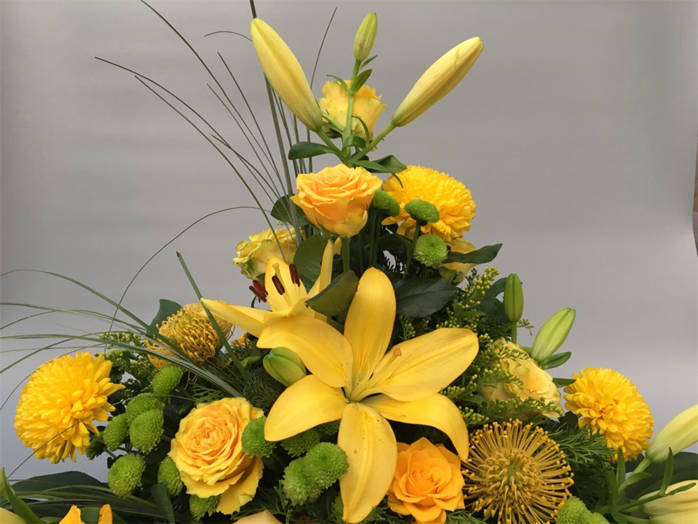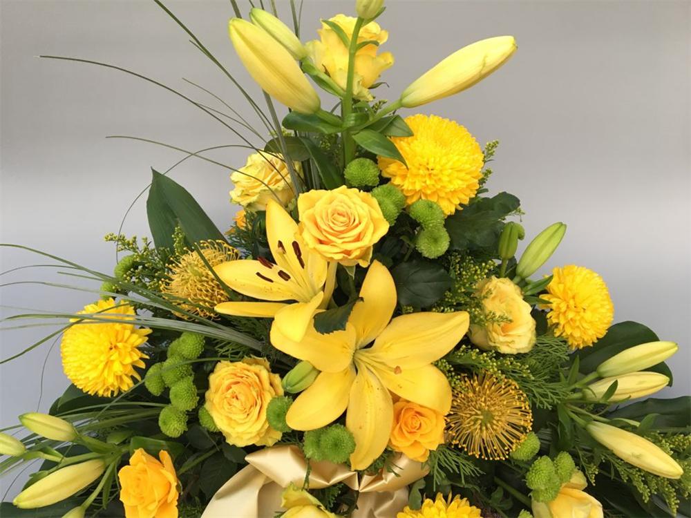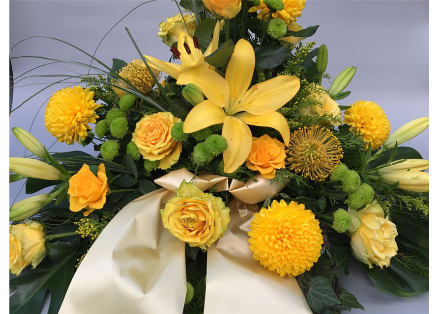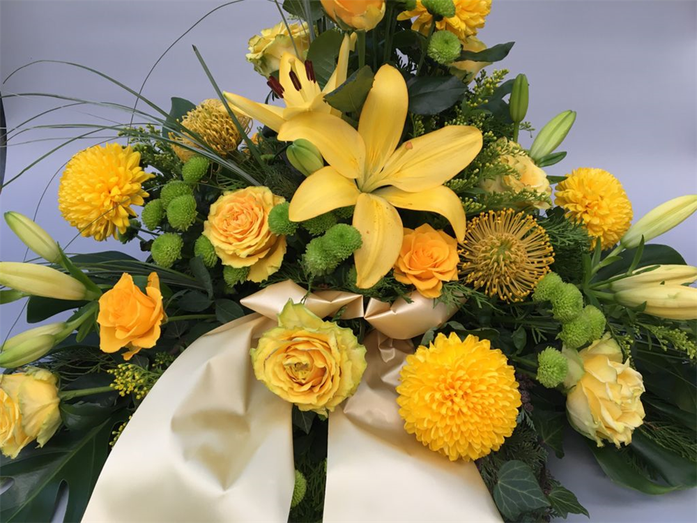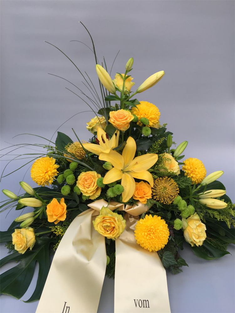 Das Trauergesteck wird mit viel Liebe und großer Sorgfalt frisch gefertigt. Bitte beachte, dass das gelieferte Trauergesteck, je nach Saison und Verfügbarkeit der einzelnen Blumen, von den Bildern abweichen kann. Hinzu kommt, dass es sich hierbei nur um das reine Gesteck handelt. Auf Wunsch kann die entsprechende Schleife dazu bestellt werden (siehe Trauerschleife).