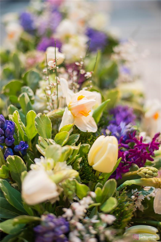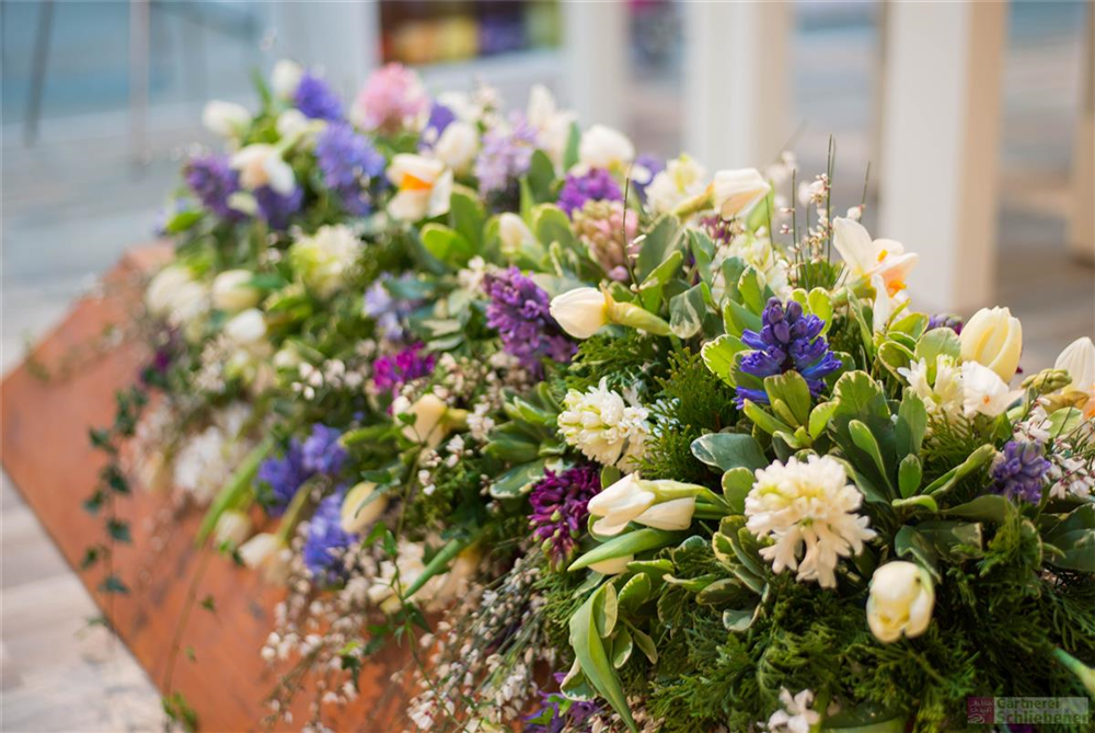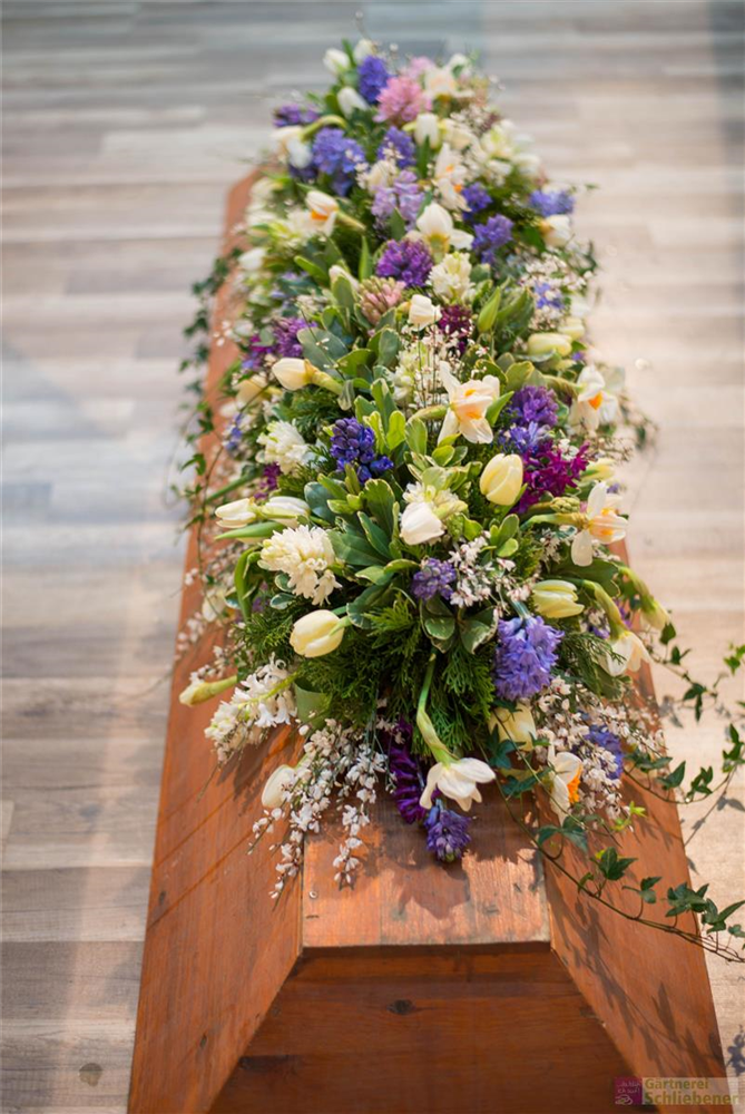 Das Sarggelege wird mit viel Liebe und großer Sorgfalt frisch gefertigt. Bitte beachte, dass der gelieferte Sargschmuck, je nach Saison und Verfügbarkeit der einzelnen Blumen, von den Bildern abweichen kann. Hinzu kommt, dass es sich hierbei nur um das reine Sarggesteck handelt. Auf Wunsch kann die entsprechende Schleife dazu bestellt werden (siehe Trauerschleife).