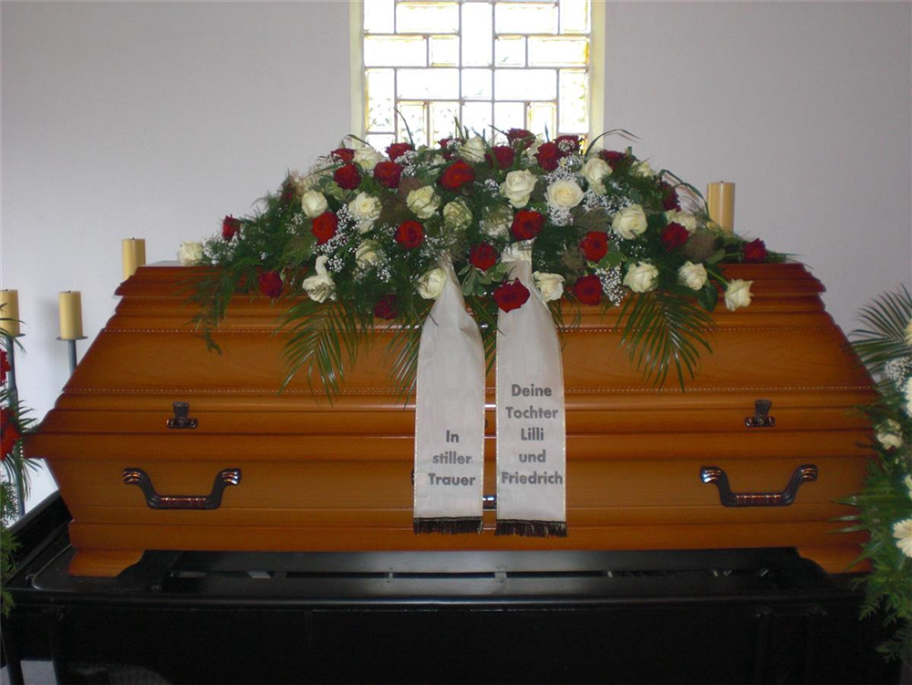 Das Sarggelege wird mit viel Liebe und großer Sorgfalt frisch gefertigt. Bitte beachte, dass der gelieferte Sargschmuck, je nach Saison und Verfügbarkeit der einzelnen Blumen, von den Bildern abweichen kann. Hinzu kommt, dass es sich hierbei nur um das reine Sarggesteck handelt. Auf Wunsch kann die entsprechende Schleife dazu bestellt werden (siehe Trauerschleife).