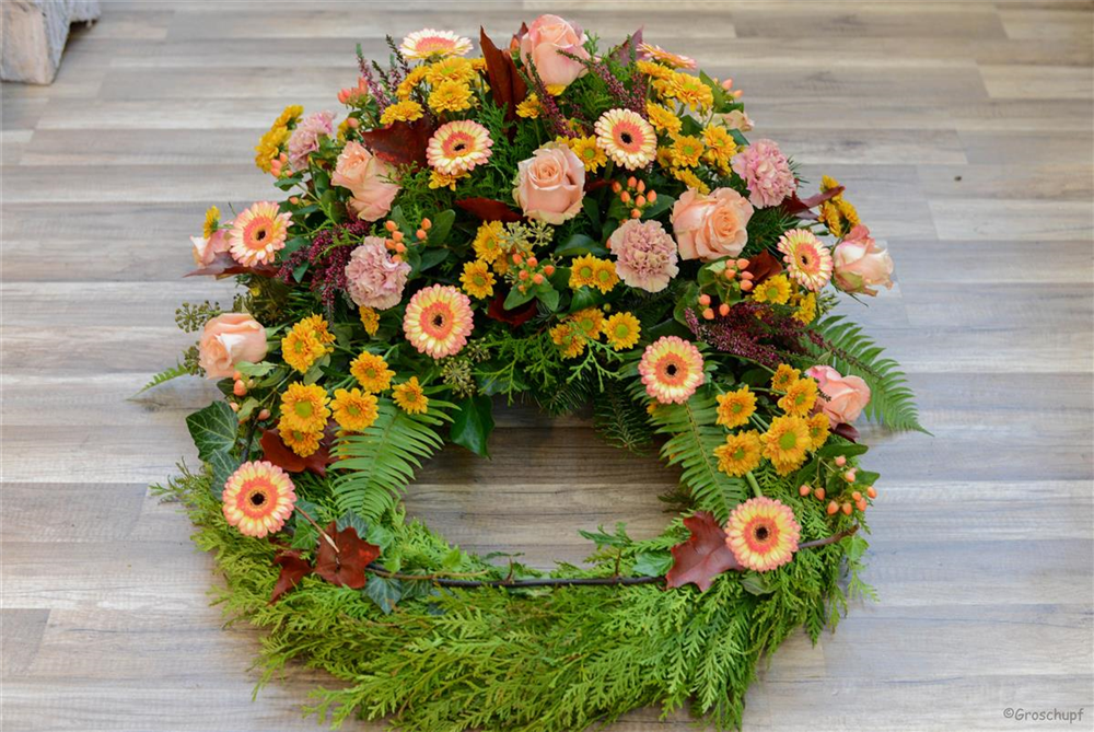 Dein Trauerkranz wird mit viel Liebe und großer Sorgfalt frisch gefertigt. Bitte beachte, dass der gelieferte Trauerkranz, je nach Saison und Verfügbarkeit der einzelnen Blumen, von den Bildern abweichen kann. Hinzu kommt, dass es sich hierbei nur um den Kranz handelt. Auf Wunsch kann die entsprechende Schleife dazu bestellt werden (siehe Trauerschleife).