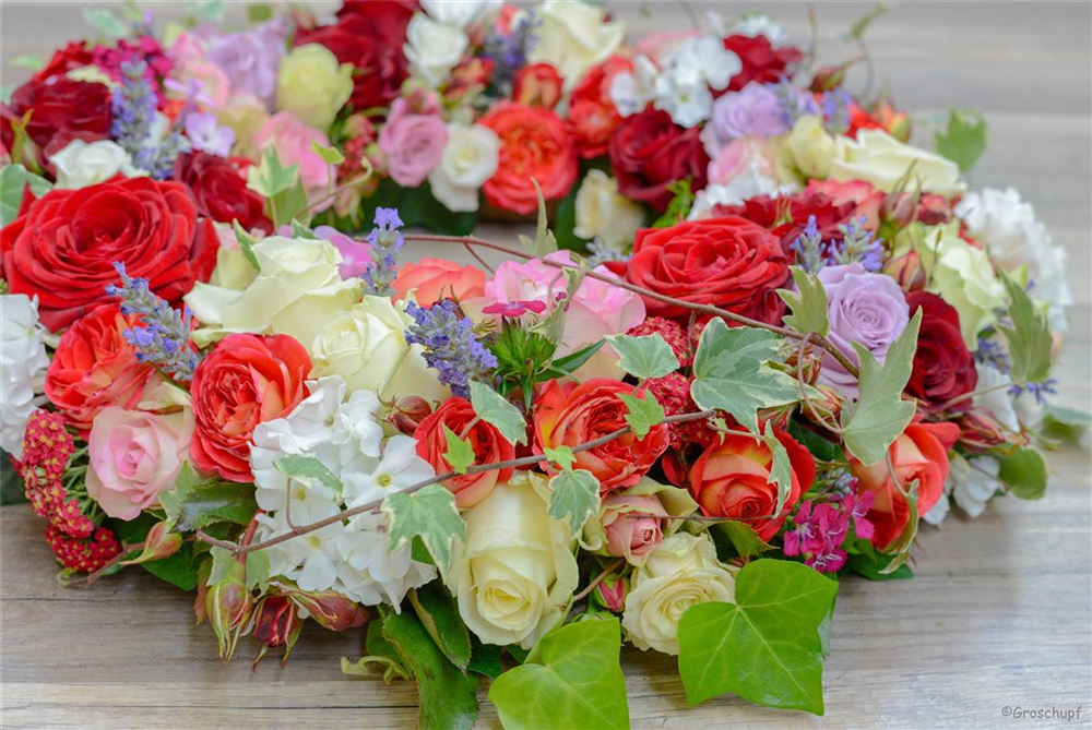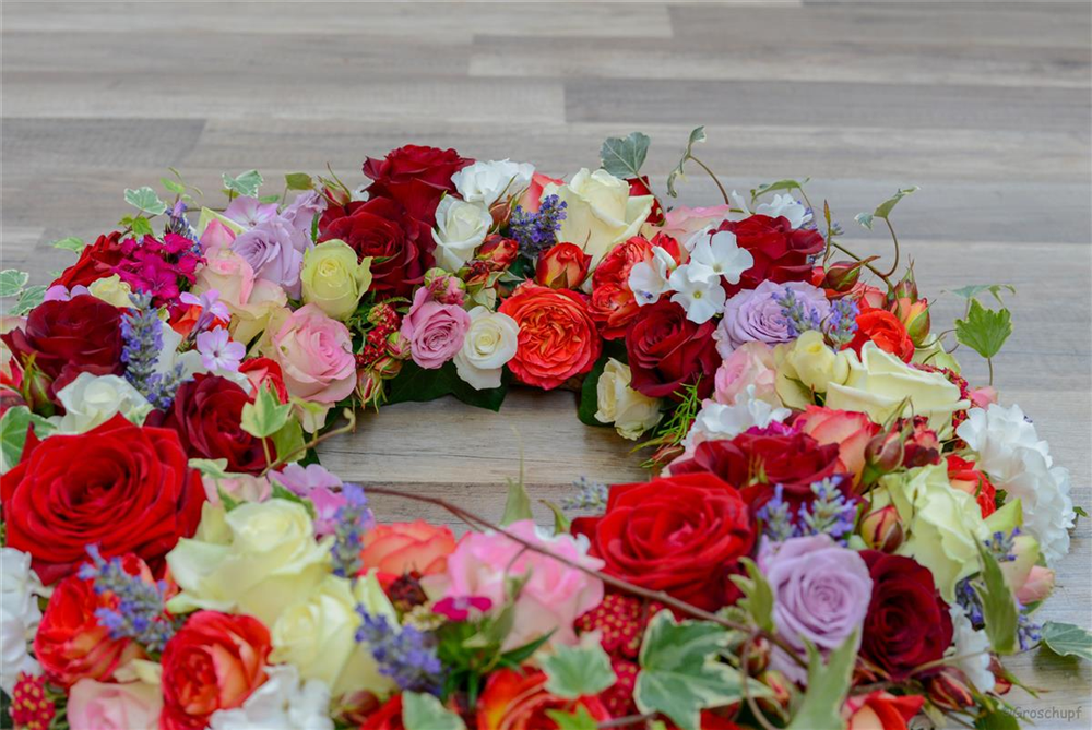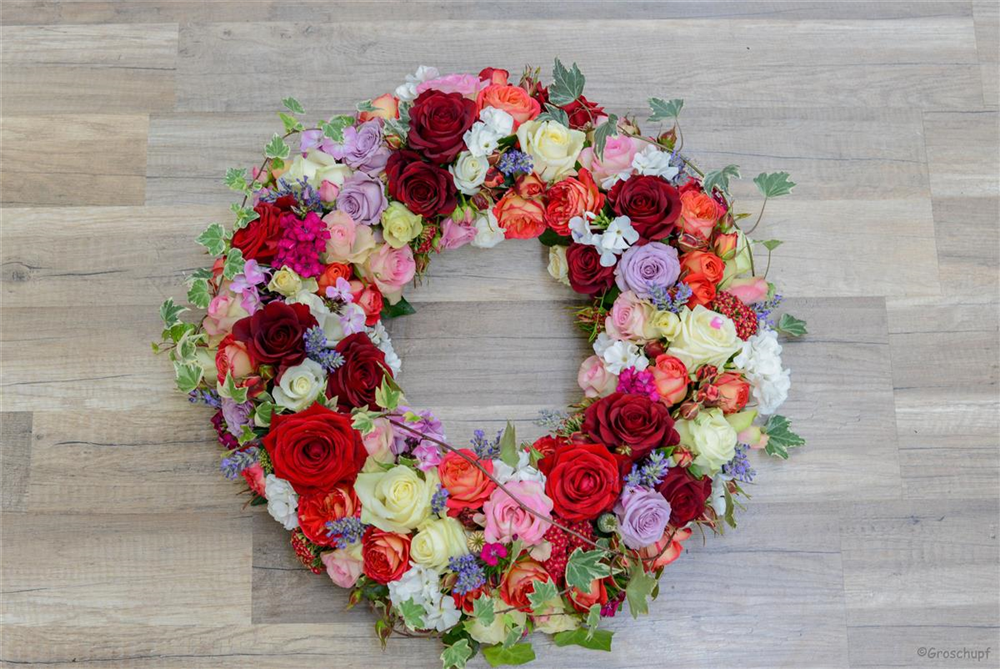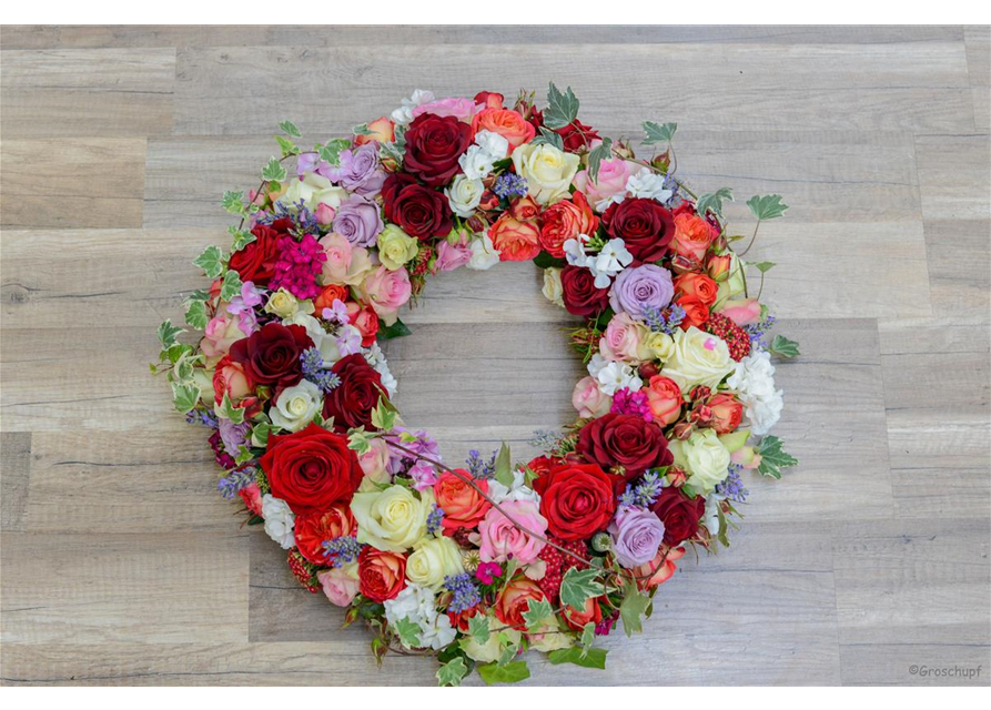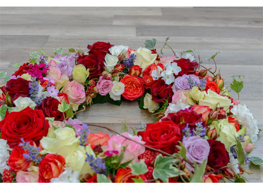 Dein Trauerkranz wird mit viel Liebe und großer Sorgfalt frisch gefertigt. Bitte beachte, dass der gelieferte Trauerkranz, je nach Saison und Verfügbarkeit der einzelnen Blumen, von den Bildern abweichen kann. Hinzu kommt, dass es sich hierbei nur um den Kranz handelt. Auf Wunsch kann die entsprechende Schleife dazu bestellt werden (siehe Trauerschleife).