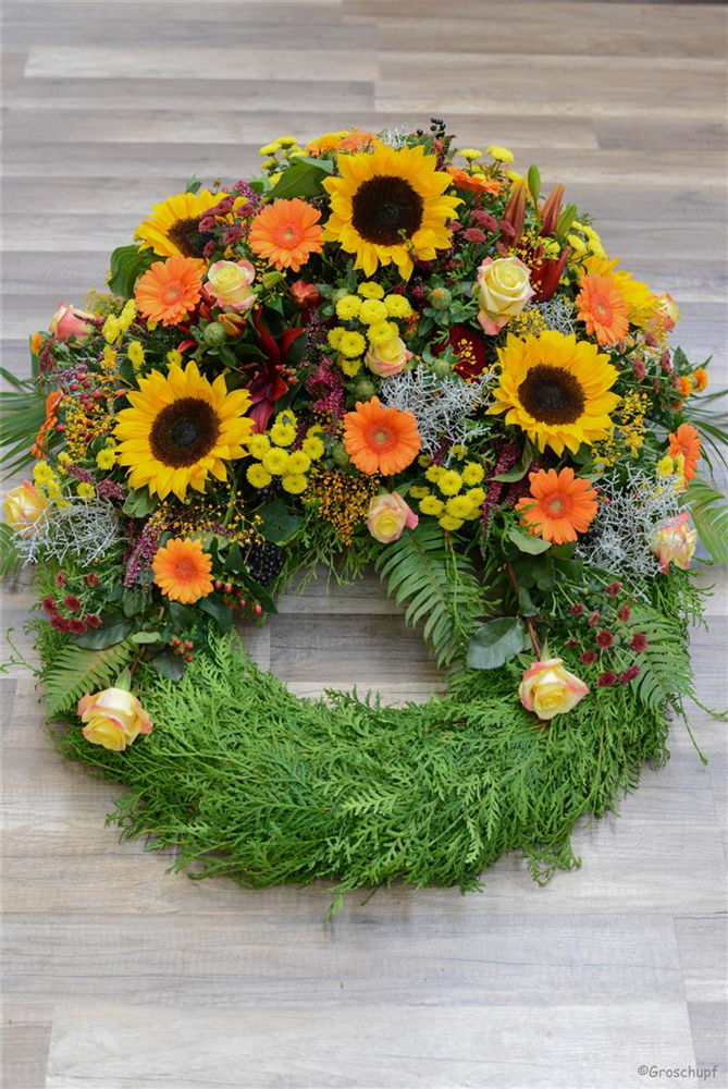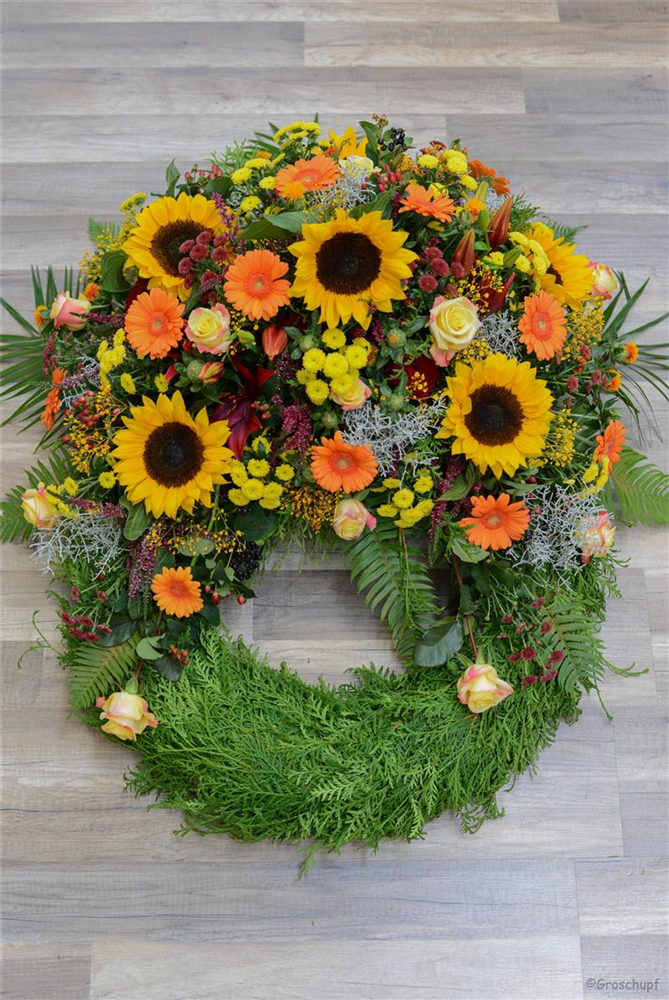 Dein Trauerkranz wird mit viel Liebe und großer Sorgfalt frisch gefertigt. Bitte beachte, dass der gelieferte Trauerkranz, je nach Saison und Verfügbarkeit der einzelnen Blumen, von den Bildern abweichen kann. Hinzu kommt, dass es sich hierbei nur um den Kranz handelt. Auf Wunsch kann die entsprechende Schleife dazu bestellt werden (siehe Trauerschleife).