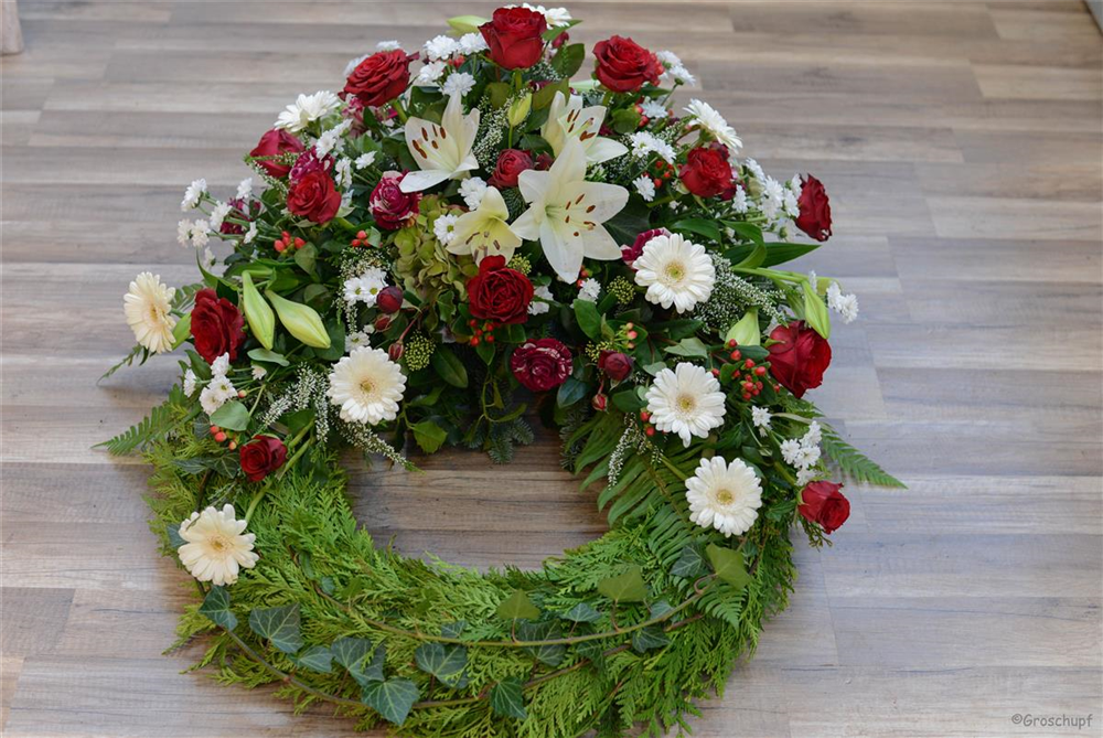 Dein Trauerkranz wird mit viel Liebe und großer Sorgfalt frisch gefertigt. Bitte beachte, dass der gelieferte Trauerkranz, je nach Saison und Verfügbarkeit der einzelnen Blumen, von den Bildern abweichen kann. Hinzu kommt, dass es sich hierbei nur um den Kranz handelt. Auf Wunsch kann die entsprechende Schleife dazu bestellt werden (siehe Trauerschleife).