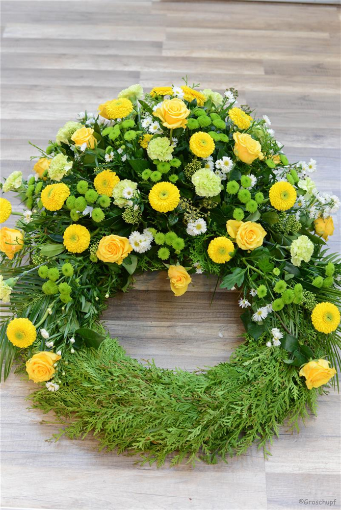 Der Trauerkranz wird mit viel Liebe und großer Sorgfalt frisch gefertigt. Bitte beachte, dass der gelieferte Trauerkranz, je nach Saison und Verfügbarkeit der einzelnen Blumen, von den Bildern abweichen kann. Hinzu kommt, dass es sich hierbei nur um den Kranz handelt. Auf Wunsch kann die entsprechende Schleife dazu bestellt werden (siehe Trauerschleife).