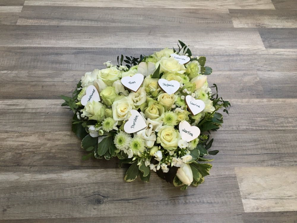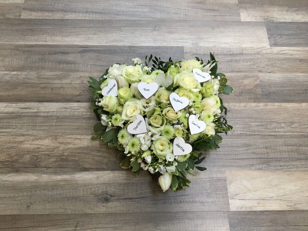 Das Trauerherz wird mit viel Liebe und großer Sorgfalt frisch gefertigt. Bitte beachte, dass das gelieferte Trauerherz, je nach Saison und Verfügbarkeit der einzelnen Blumen, von den Bildern abweichen kann. Hinzu kommt, dass es sich hierbei nur um das reine Herz handelt. Auf Wunsch kann die entsprechende Schleife dazu bestellt werden (siehe Trauerschleife).