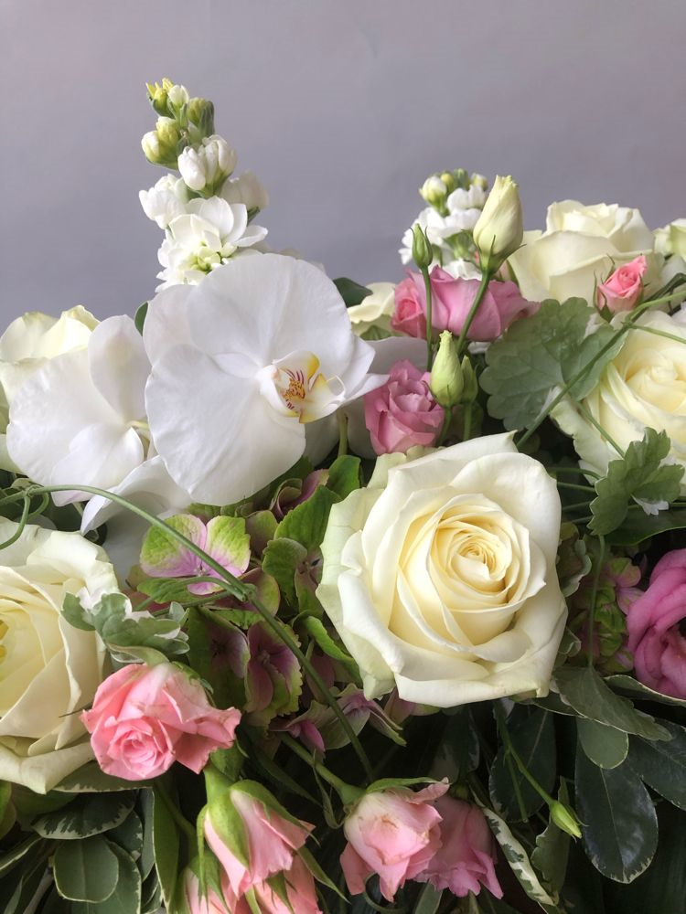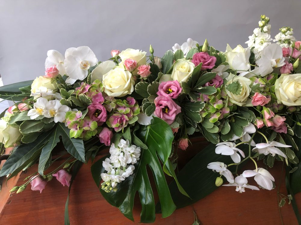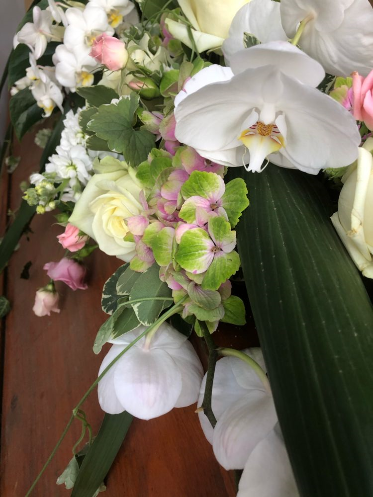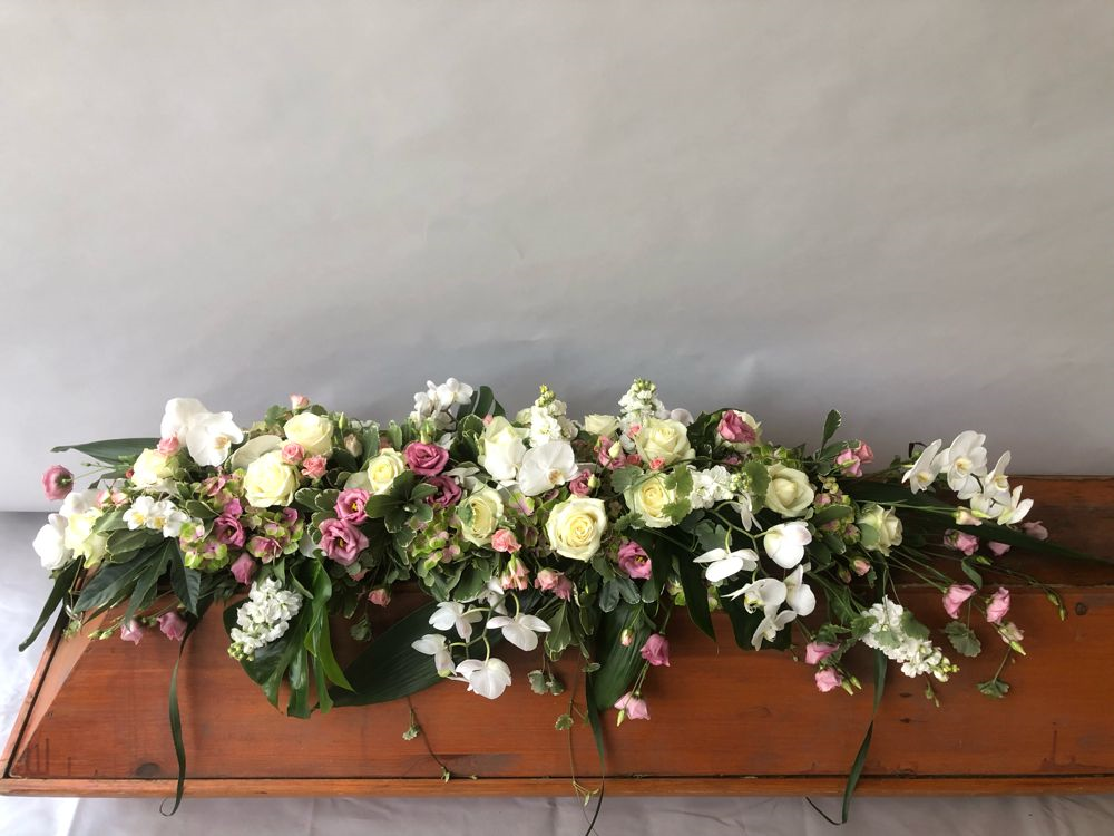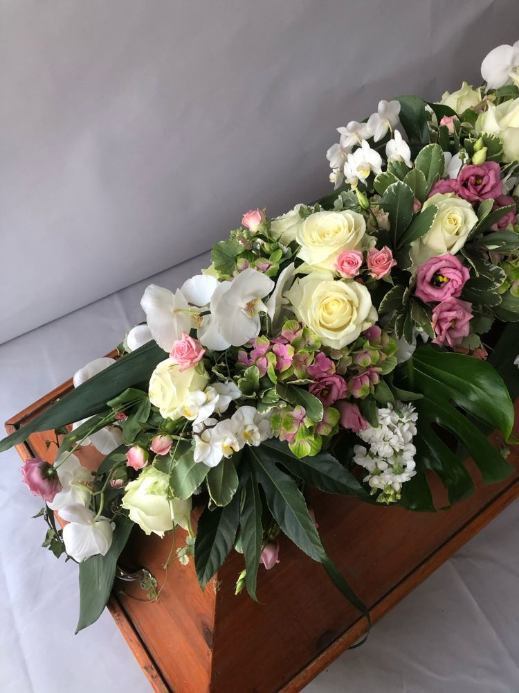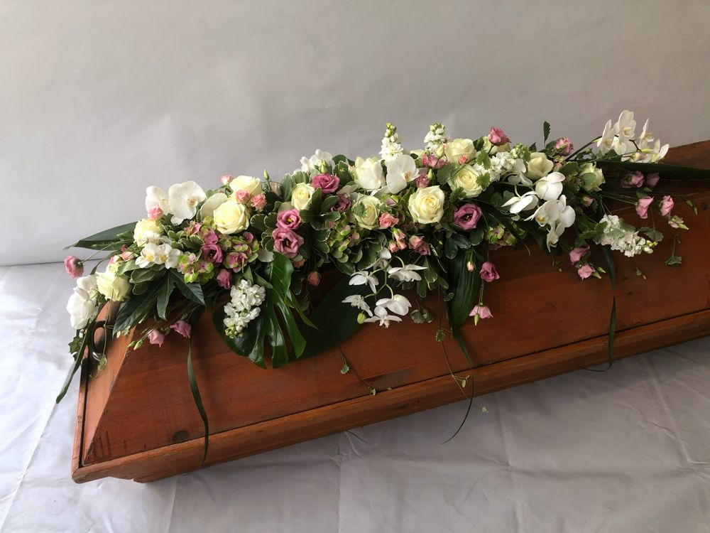 Das Sarggelege wird mit viel Liebe und großer Sorgfalt frisch gefertigt. Bitte beachte, dass der gelieferte Sargschmuck, je nach Saison und Verfügbarkeit der einzelnen Blumen, von den Bildern abweichen kann. Hinzu kommt, dass es sich hierbei nur um das reine Sarggesteck handelt. Auf Wunsch kann die entsprechende Schleife dazu bestellt werden (siehe Trauerschleife).