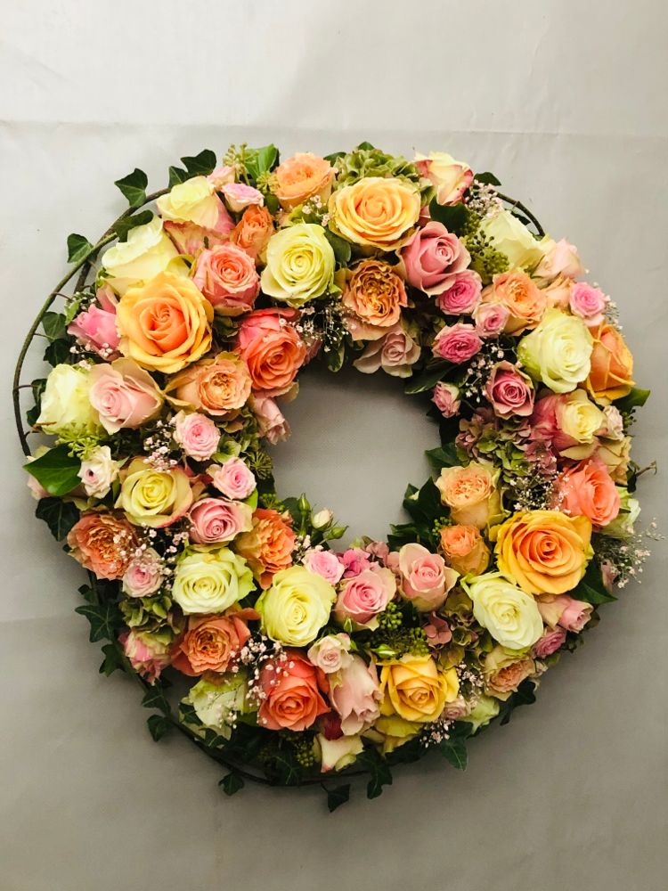 Dein Trauerkranz wird mit viel Liebe und großer Sorgfalt frisch gefertigt. Bitte beachte, dass der gelieferte Trauerkranz, je nach Saison und Verfügbarkeit der einzelnen Blumen, von den Bildern abweichen kann. Hinzu kommt, dass es sich hierbei nur um den Kranz handelt. Auf Wunsch kann die entsprechende Schleife dazu bestellt werden (siehe Trauerschleife).