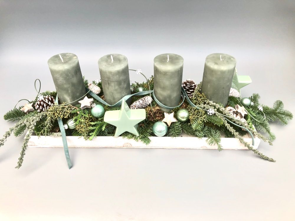 Adventsgesteck Mintgrün auf Tablett 60x20x30cm