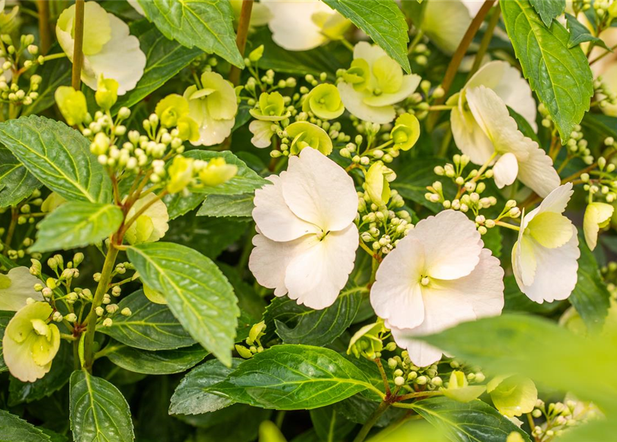 Die weißen, schalenförmigen Blüten der Girlanden-Hortensie 'Runaway Bride'® erscheinen in Dolden von Juni bis September.