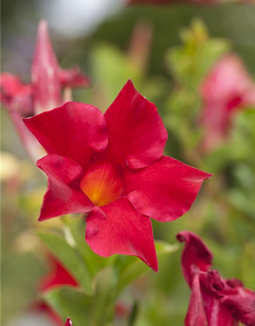Mandevilla sanderi 'Sundaville® Red' bildet während der gesamten Saison zahlreiche trichterförmige, in Rispen angeordnete, rote Blüten. Diese werden etwa 1 - 5 cm groß.