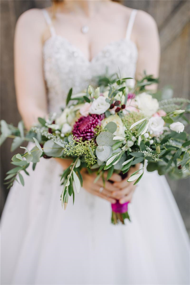 Brautstrauß weiß-bordeaux mit Eukalyptus