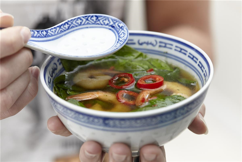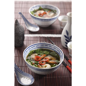 Alles für 5 Minuten köcheln lassen. Garnelen kurz in einer Pfanne anbraten und mit dem Spinat zusammen auf 4 Suppentassen verteilen. Dann die Suppe darüber gießen und servieren.